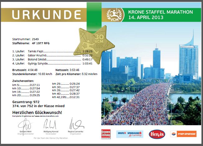 Mint a Vienna City Marathon 4F RFG csapat kapitánya közlöm veletek, hogy sikeresen teljesítettük feladatunkat !!!